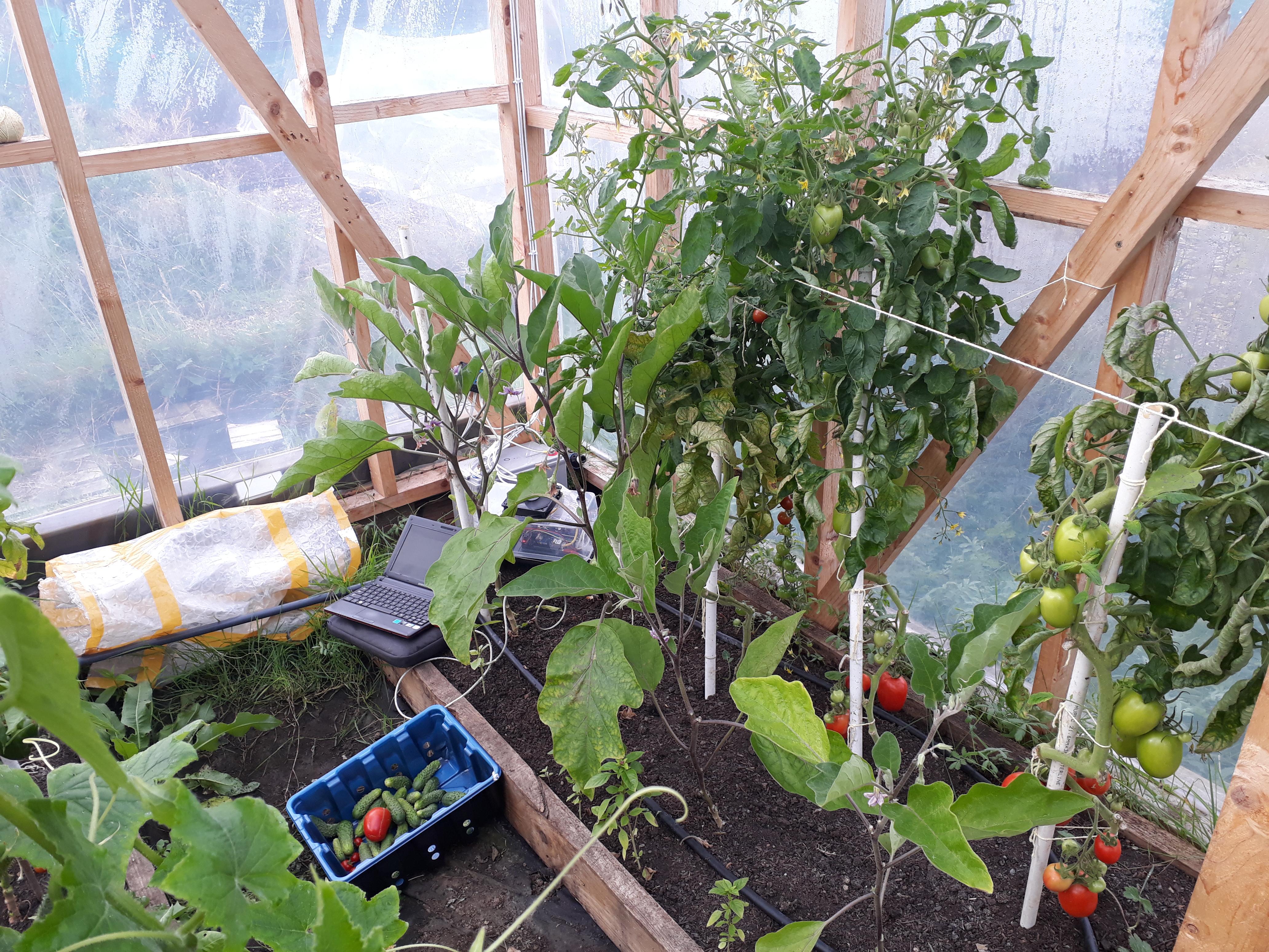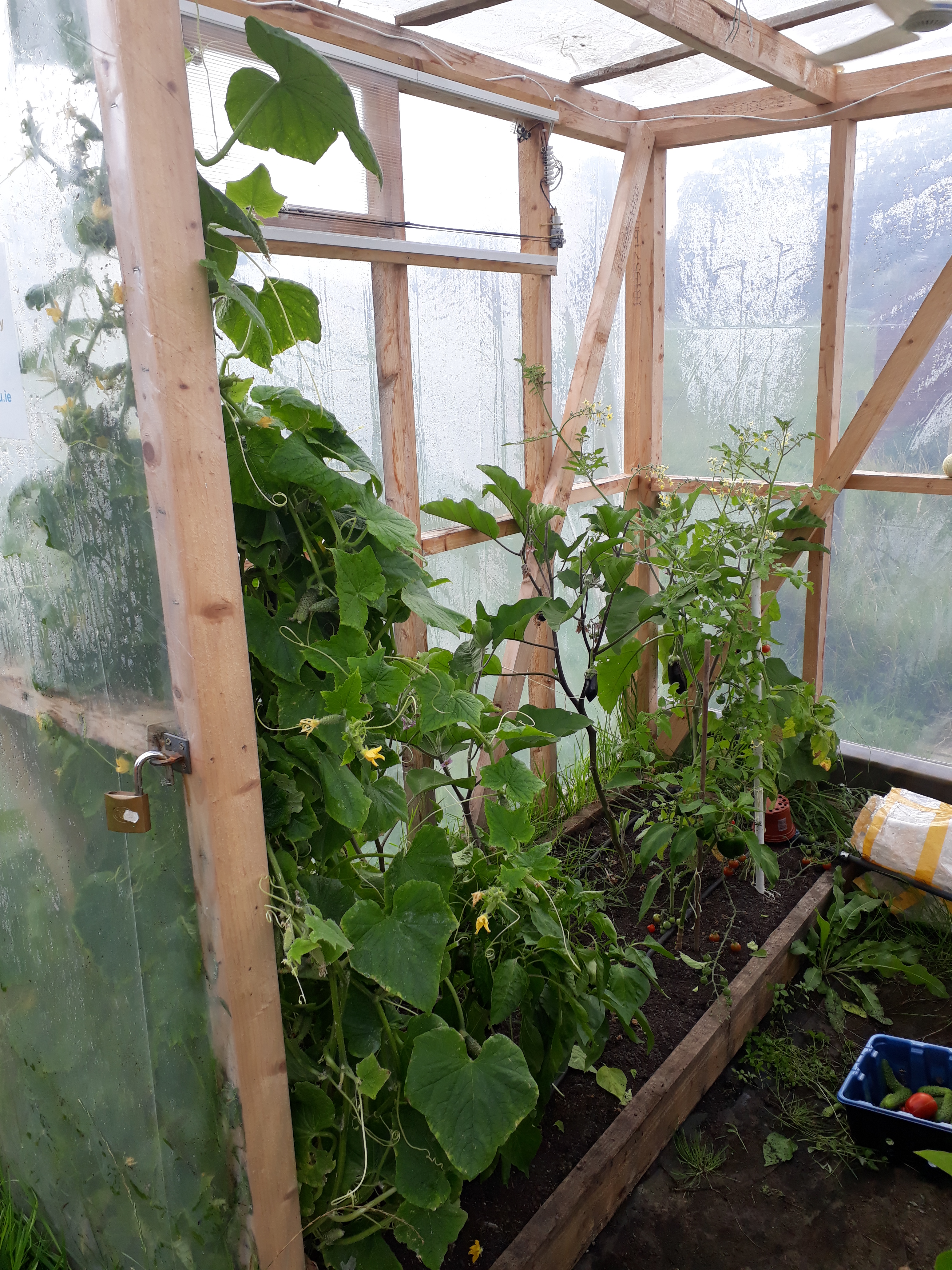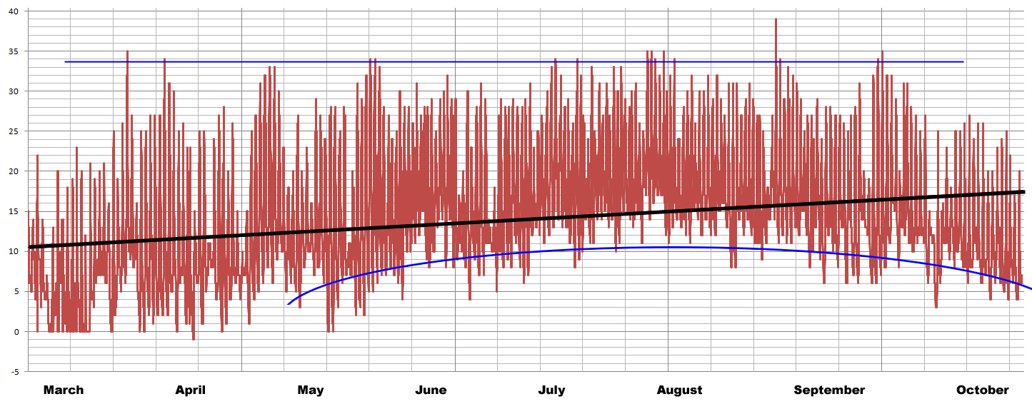 Since March the average temperature inside the polycube at one of the research locations increased slightly (as indicated by the black line), proving that the automation managed to keep the local climate within surviving limits for the vegetables. Even with temperatures as low as 0 Centigrade during night at the beginning of May, the mid-day temperatures would have gone well above at least 40 Centigrade. The overall maximum temperature however was kept below 35 centigrade, even during (the Irish) mid-summer – by opening the windows and starting the ventilation fan. Over-the-night temperature increased slightly as the weather improved. A heating system would have helped by keeping the lows within more narrow margins. A future project maybe?